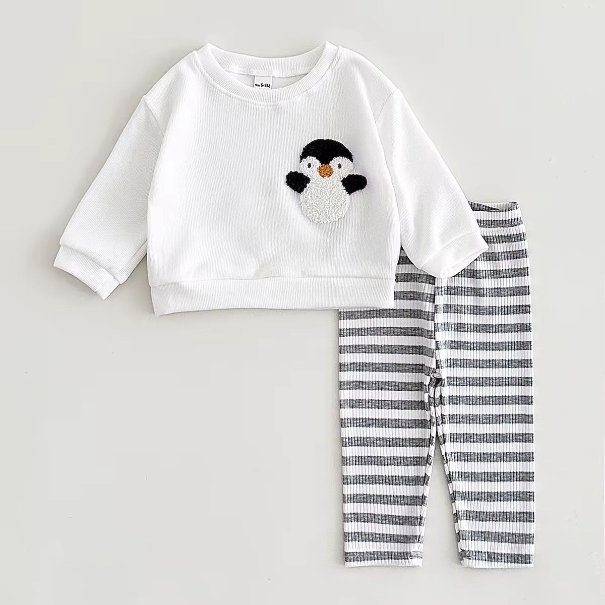 This adorable combo includes a soft cotton pullover featuring a textured penguin patch and a pair of stretchy striped leggings for all-day flexibility. Designed with breathable fabric to keep little ones warm but never too hot.