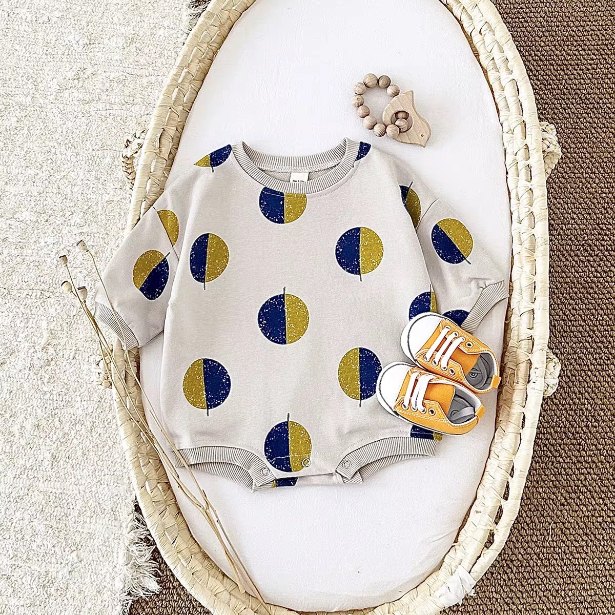 Crafted from 100% breathable cotton, this romper features a unique two-tone circle print in mustard and navy – giving it a retro vibe with a modern twist. The long sleeves and relaxed fit make it perfect for cooler days or layering.