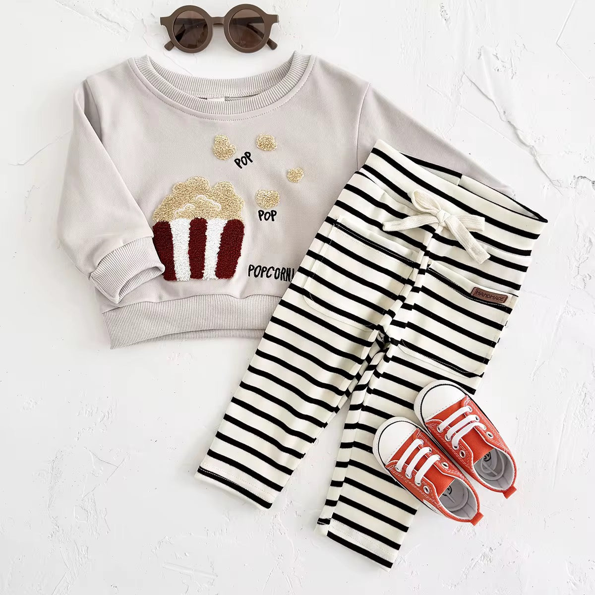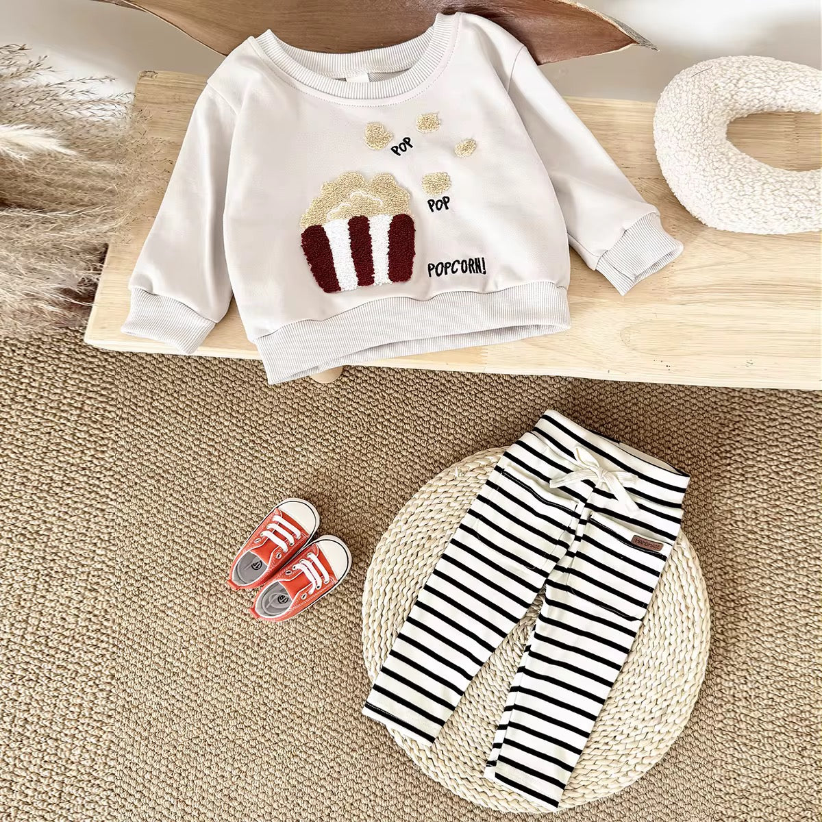 Featuring a soft cream sweatshirt with a fluffy popcorn tub design and cheeky "POP POP POPCORN!" embroidery, it’s the perfect mix of fun and functional. Paired with classic striped leggings for all-day comfort and movement.